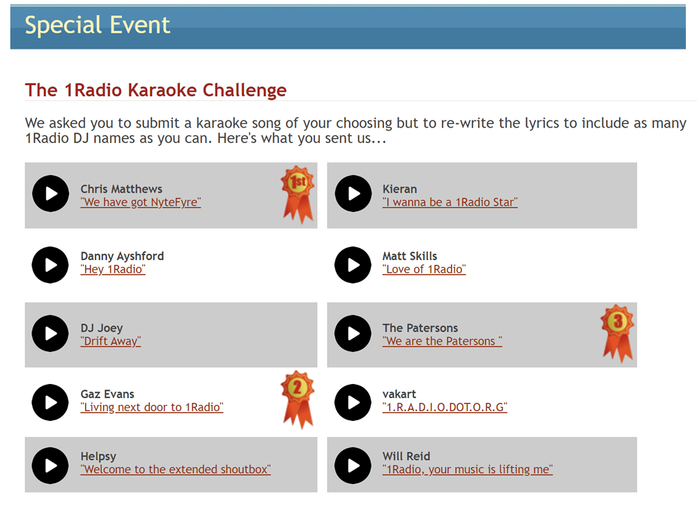 The premise of the competition was simple. Re-record a well known song and include in it as many 1Radio presenter names as possible. Presenters had a few weeks to submit their entries. The quality of the submissions was inversely proportional to how near to the closing date it was submitted. During the show in which I revealed all the entries and let listeners submit votes, the Patersons posted their entry. It was added to the competition show page even as the show was going out! That should give you a sense of how awful it was. Sorry. Did I say awful? That's unfair. It was f***ing attrocious.